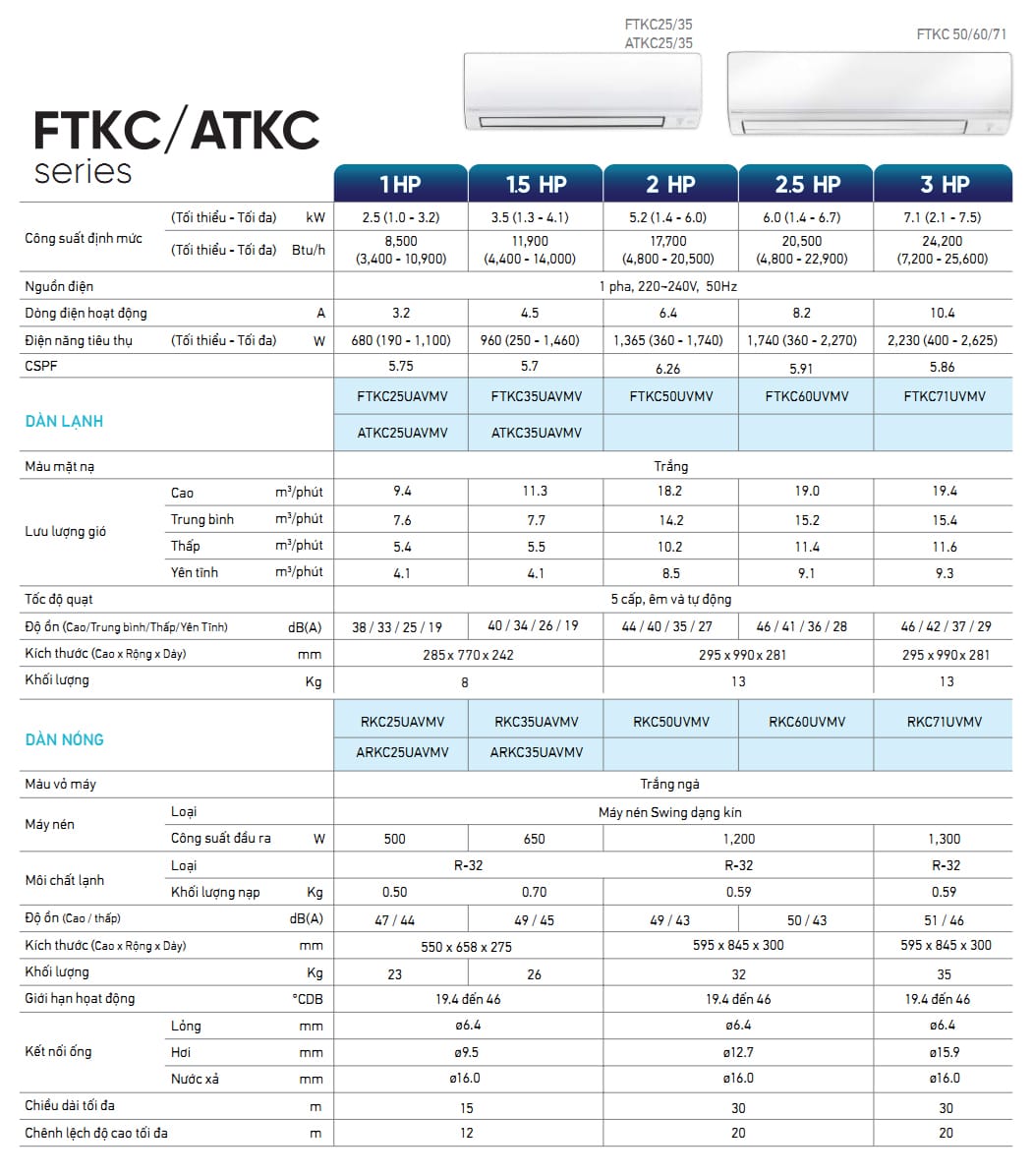 | THÔNG SỐ KỸ THUẬT Máy lạnh Daikin FTKC35UAVMV (1.5Hp) Inverter | |